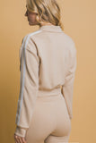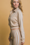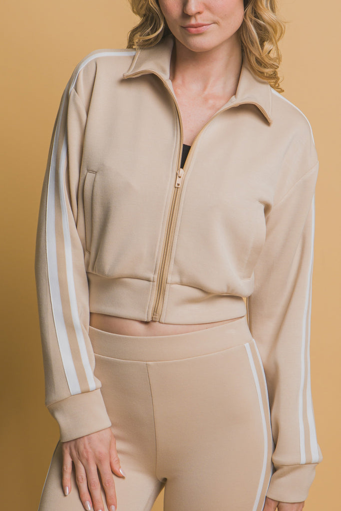 Stay active and stylish in this cropped athletic zip-up jacket, crafted from a soft rayon and poly blend for comfortable movement. The beige tone pairs effortlessly with any outfit, while sporty stripes add energetic flair. Perfect for warm-ups or casual days, its lightweight feel keeps you cool and ready to move.