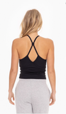 This black tank top features a built-in bra for added support and a cropped design for a flattering fit. The spaghetti string back adds a touch of femininity to this athletic piece. Look and feel your best during any workout.