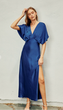 Indulge in luxury with this Satin Maxi Dress. The midnight blue satin fabric exudes elegance while the blouson top and slit detail add a touch of allure. Perfect for a special evening or event, this dress is sure to make you feel confident and glamorous.