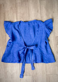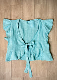 The Front Tie Cardigan, made from 100% linen, offers a lightweight and breathable option for sophisticated layering. Its short sleeves and elegant ruffle detail add a touch of refinement, while the front tie enhances the silhouette, making it an ideal choice for polished, versatile styling. All tops are ONE SIZE.