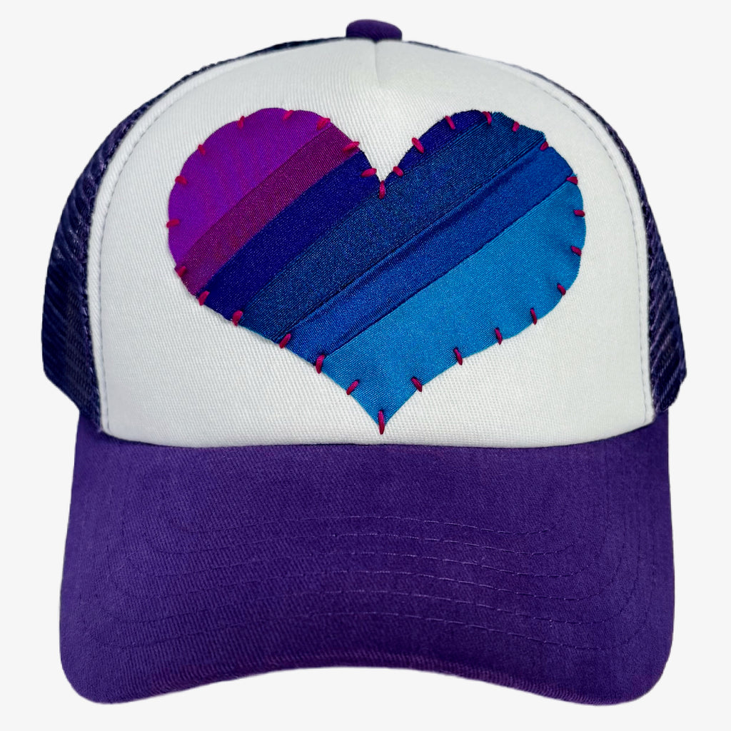 We took swimwear fabric scraps and up-cycled them into hand made, beautiful, one of a kind Heart and Star patches. Each patch is then hand sewn onto truckers hats in a variety of colors and hat shapes. Every one of them is unique and you'll be spreading love every time you wear them! Handmade by Zoë Bikini