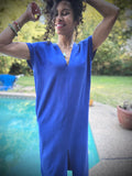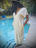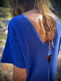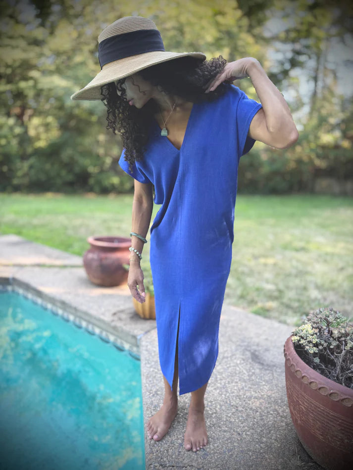Made in a carefully curated buttery soft linen blend, pockets, front slit for movement, deep V front and a deep V cutout back creating a sexy reverse option