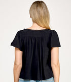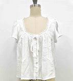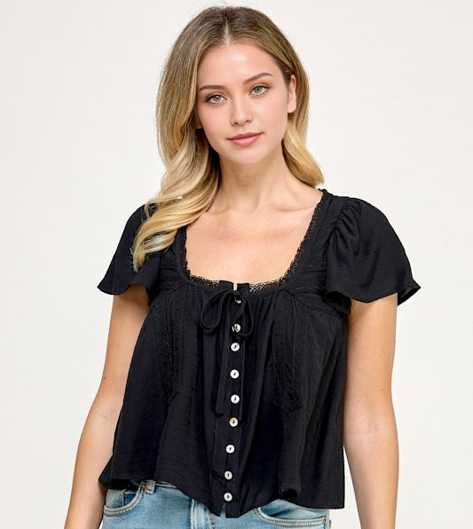 This playful short sleeve blouse blends sweet charm with a delicate touch of lace. Made from soft cotton, it features a button-down front and arrives in classic black and off-white. Effortlessly cute and comfortable, it’s perfect for adding a flirty twist to your everyday style.