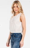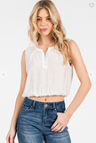This white sleeveless blouse features delicate little buttons and an elastic cropped waist for a fun, flirty fit. Perfect for sunny days or layering, it adds a playful touch to any outfit while keeping you cool and comfortable. 100% Poly