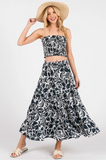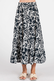 This playful tiered maxi skirt features a charming navy and white floral print, perfect for sunny summer days. Its elastic waist ensures a comfy fit while the flowing tiers add a breezy, carefree vibe. Ideal for staying cool and stylish when the heat is on!