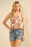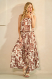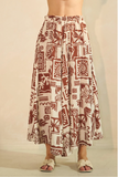 These wide leg crop pants bring summer vibes to your wardrobe with their breezy rayon-nylon blend fabric. Featuring an elastic waistband for easy comfort and handy side pockets, they’re perfect for sunny days and relaxed outings. The brown and white print adds a playful touch to your look while keeping you cool and stylish all season long. Pair with the matching top style #D2797 to complete the look!