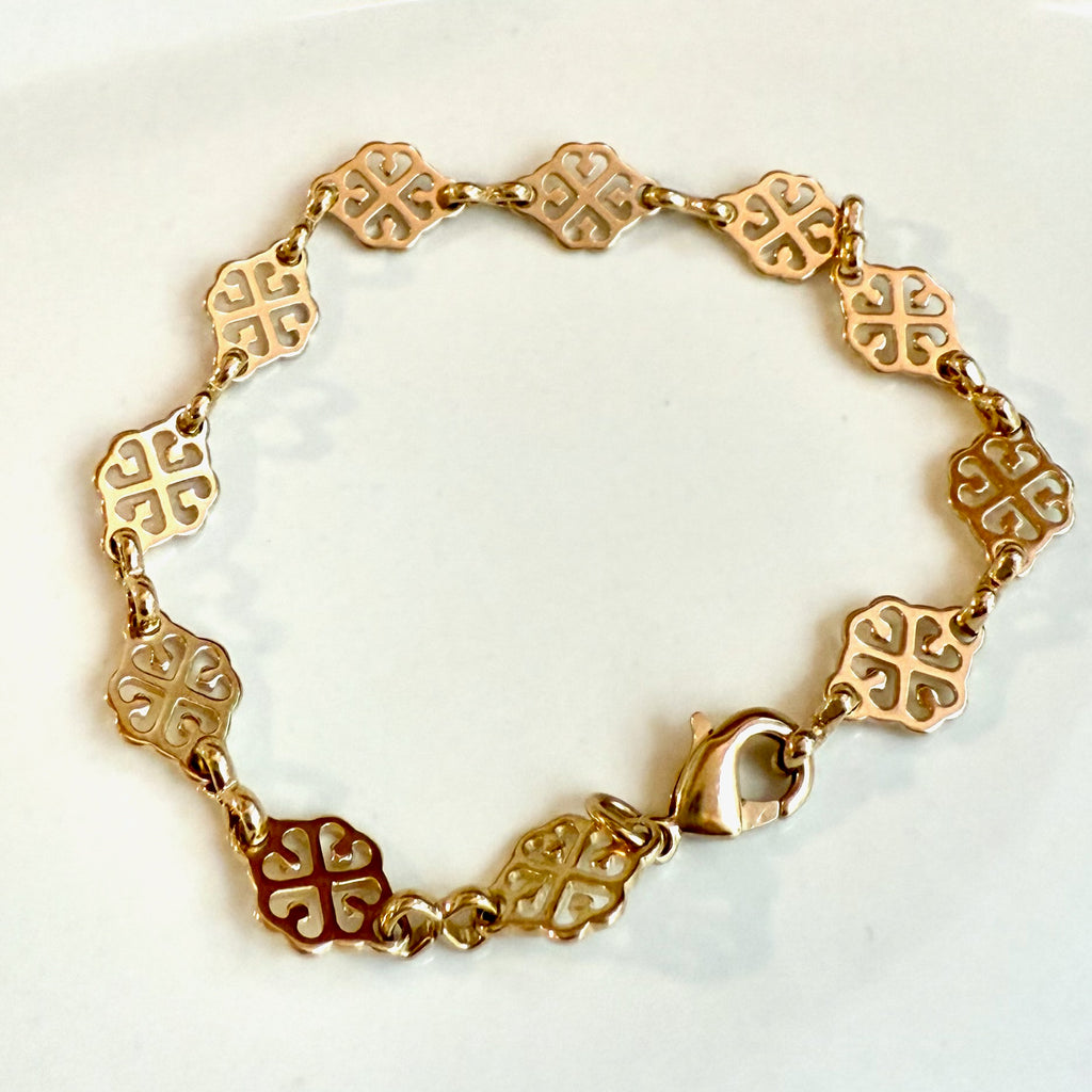 This 24 karat gold plated bracelet is approximately 7 inches with a secure clasp closure. Made with high-quality materials, this elegant and timeless piece will add a touch of luxury to any outfit. Handmade by Zoë Bikini