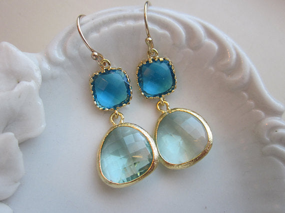 These earrings are 16k gold plated glass gems. The ear wires are 14k gold filled, which are perfect for sensitive ears/skin. The length of the earrings is approximately 1 inch long. These earrings are so simple and classy. They can be worn for a variety of occasions - wedding, evening events, work, or simply everyday!