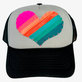 We took swimwear fabric scraps and up-cycled them into hand made, beautiful, one of a kind Heart and Star patches. Each patch is then hand sewn onto truckers hats in a variety of colors and hat shapes. Every one of them is unique and you'll be spreading love every time you wear them! Handmade by Zoë Bikini