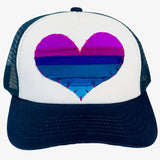We took swimwear fabric scraps and up-cycled them into hand made, beautiful, one of a kind Heart and Star patches. Each patch is then hand sewn onto truckers hats in a variety of colors and hat shapes. EVERY ONE of them is unique and you'll be spreading LOVE every time you wear them! Handmade by Zoë Bikini