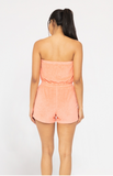 This peach colored strapless romper is the perfect summer outfit for a comfortable and stylish look. The elastic waistband and reverse patch pockets provide convenience and the soft terry cloth fabric adds an extra touch of comfort. Stay fashionable and comfortable with our romper.
