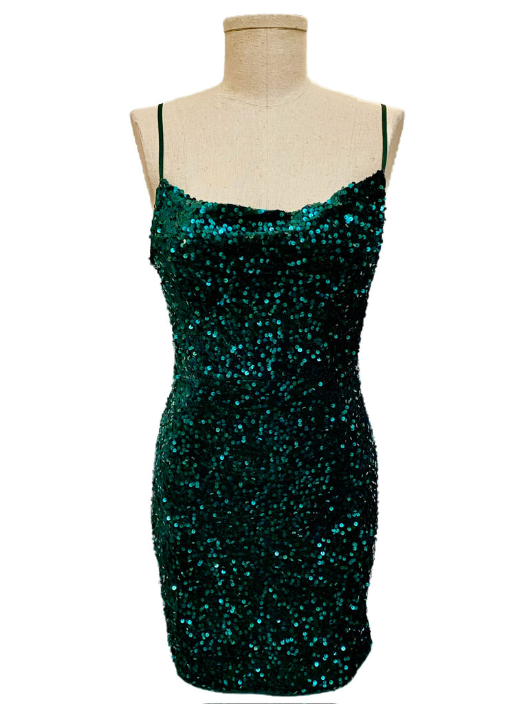 Shine bright and turn heads in this emerald green sequin mini dress! The cowl neckline and adjustable spaghetti straps add a touch of elegance while the fully lined and zipper back provide comfort and ease. Perfect for holiday fun and party time. Stand out in style with this must-have dress!