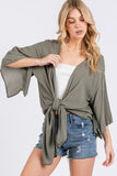 This Tie Front Cardigan is your new go-to for layering with flair. Featuring a playful front tie and breezy 3/4 sleeves, this lightweight cardigan adds a fun twist to any outfit. Its open front design makes it easy to pair with your favorite tops, offering versatile style for any season. Perfect for those days when you want a little extra coverage without the weight.